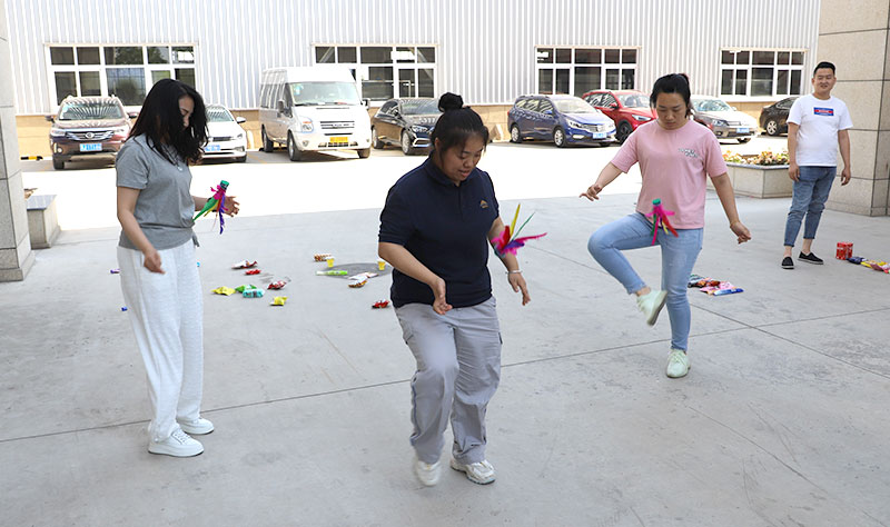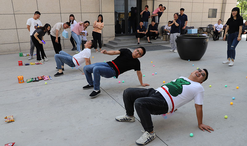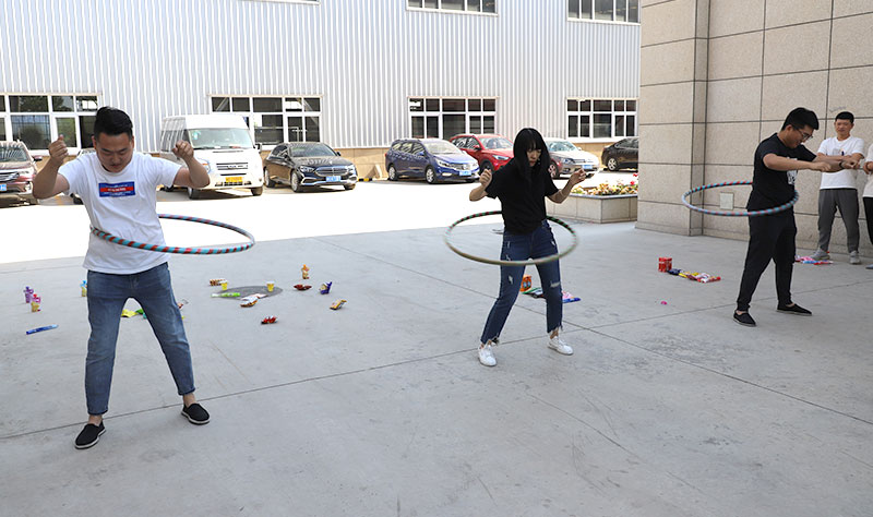 “旋轉呼啦圈、組隊踢毽子、公雞下蛋、快樂傳遞、螃蟹賽跑……員工們充滿了歡聲笑語、玩兒得不亦樂乎。手拉手站成一排,用呼啦圈穿過所有人的身體,用時最短的隊伍最終取得獲勝……每隊出三個代表,腰間都系上道具盒,通過不斷扭動身體讓盒里的乒乓球掉下來,用時最短的隊獲勝……