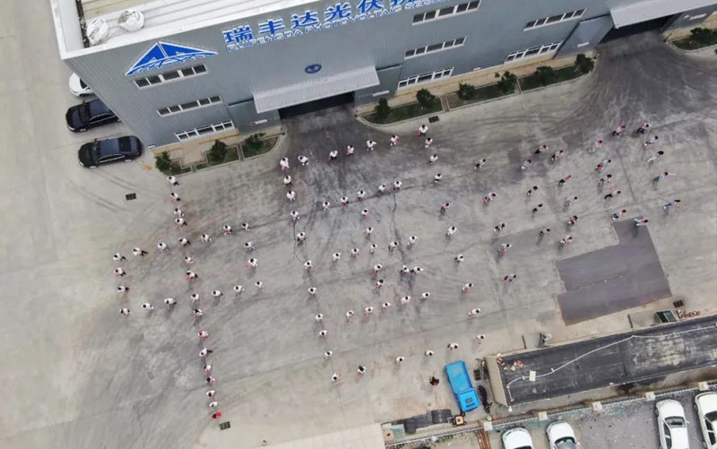 活動(dòng)第一部分,全體員工在廠區(qū)門口空地上擺出”中國100“字樣,畫面十分氣派。
